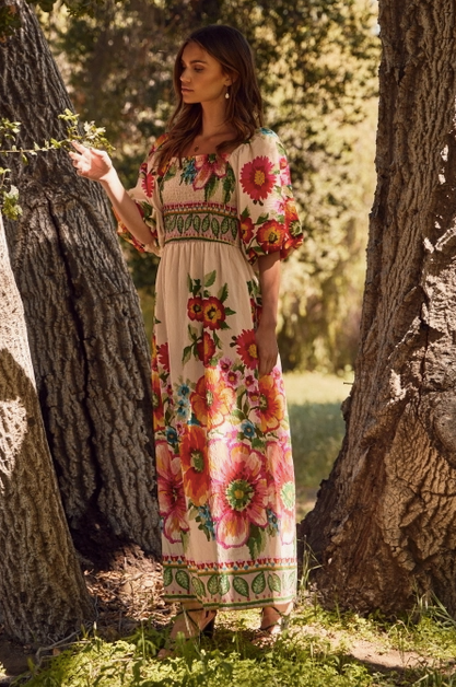 Giant floral border printed maxi dress with bubble sleeve and smocked top.