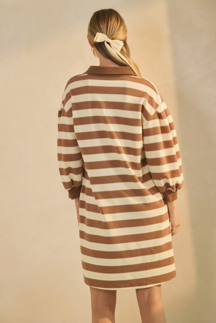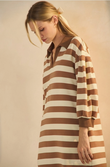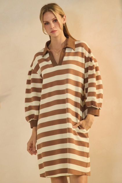 Striped ottoman dress with contrast collar and voluminous half sleeves.