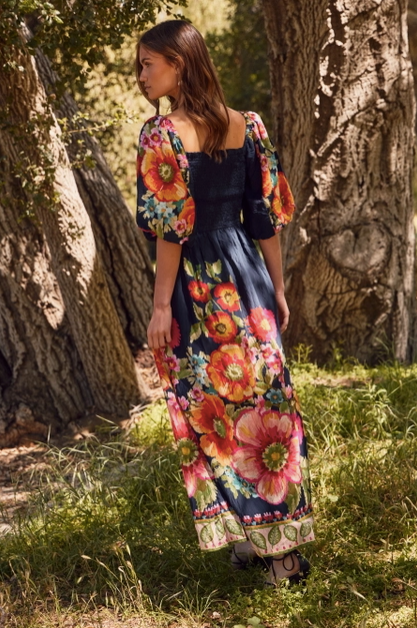 Giant floral border printed maxi dress with bubble sleeve and smocked top.