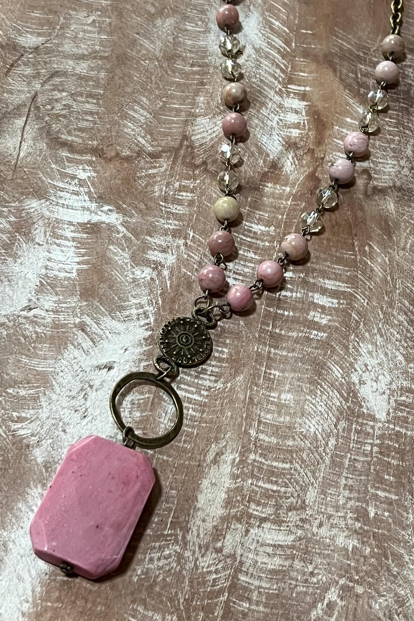 Long chain necklace with beading on the bottom half. Includes a beautiful polished agate pendant. Has a toggle closure.